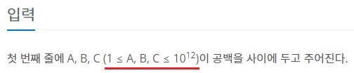 첫 번째 줄에 A, B, C (1 ≤ A, B, C ≤ 1012)이 공백을 사이에 두고 주어진다.